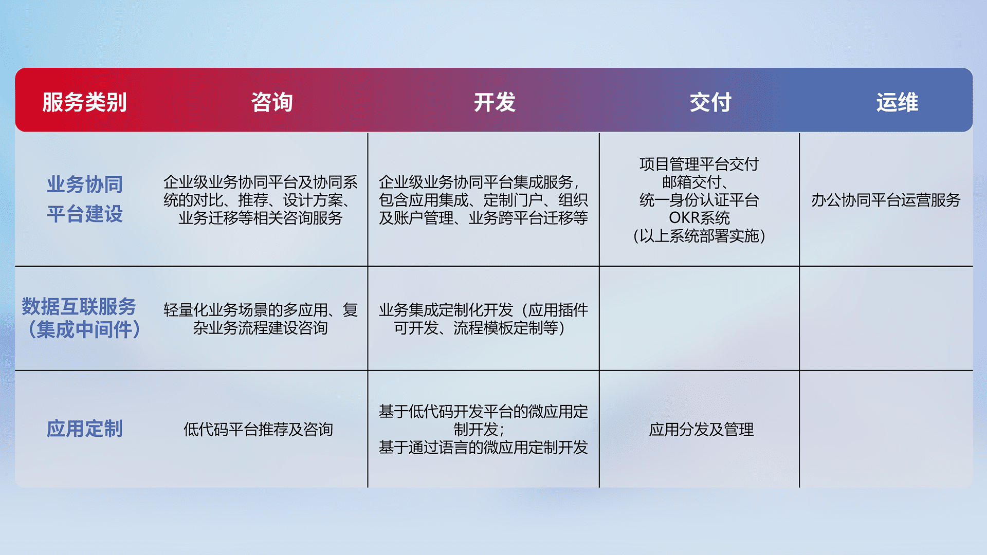 针对钉钉、、、企微、、IDaas等平台级产品提供产品的规划、、、方案、、、、交付、、定制化开发等服务,,,实现如统一协同办公、、智能客户服务、、、混合会议管理、、、、智能数据查询、、、等业务场景,,,,实现数字化转型。。